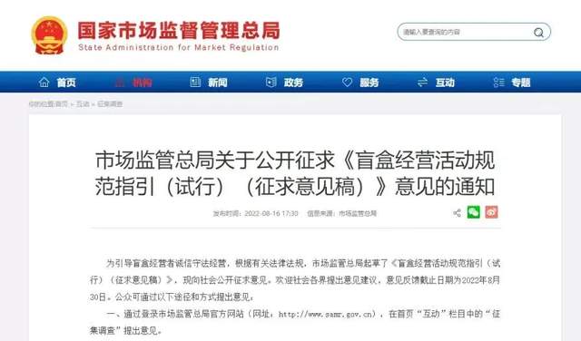 而现在,“盲盒+”模式恐怕不能胡乱套用了。8月16日,国家市场监管总局发布了关于公开征求《盲盒经营活动规范指引(试行)(征求意见稿)》意见的通知,到8月30日截止反馈。